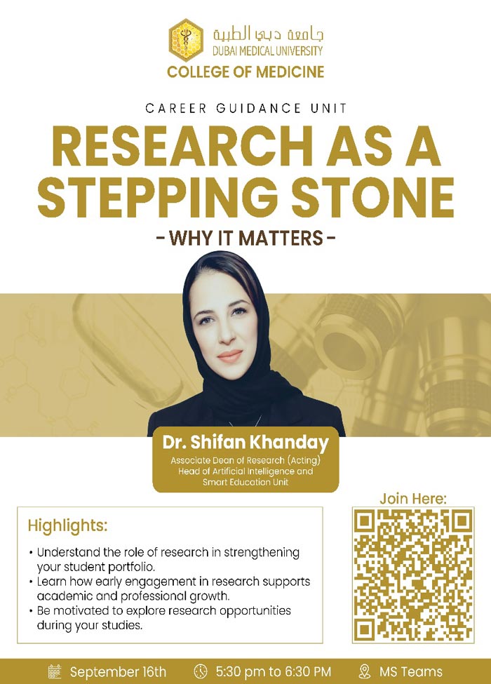We were pleased to have hosted an engaging Career Guidance Session on “Research as a Stepping Stone – Why It Matters,” conducted by Career Guidance office at the College of Medicine and facilitated by Dr. Shifan Khanday. The session highlighted the crucial role of research in shaping a strong medical career.