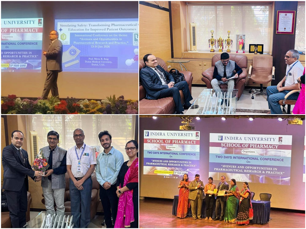 Professor Mirza R. Baig, Program Director for the Master of Clinical Pharmacy and Professor of Pharmacy Practice at the College of Pharmacy – Dubai Medical University (DMU), was invited as a speaker at an international conference organized by Indira University, Pune, India, held on 13–14 January 2026. During the conference, he delivered an insightful and forward-looking presentation on “Simulation Safety in Pharmacy Education: Enhancing the Role of the Clinical Pharmacist in the Patient Care Process.” His talk highlighted the critical importance of simulation-based education in preparing pharmacy graduates for safe, effective, and patient-centered clinical practice.