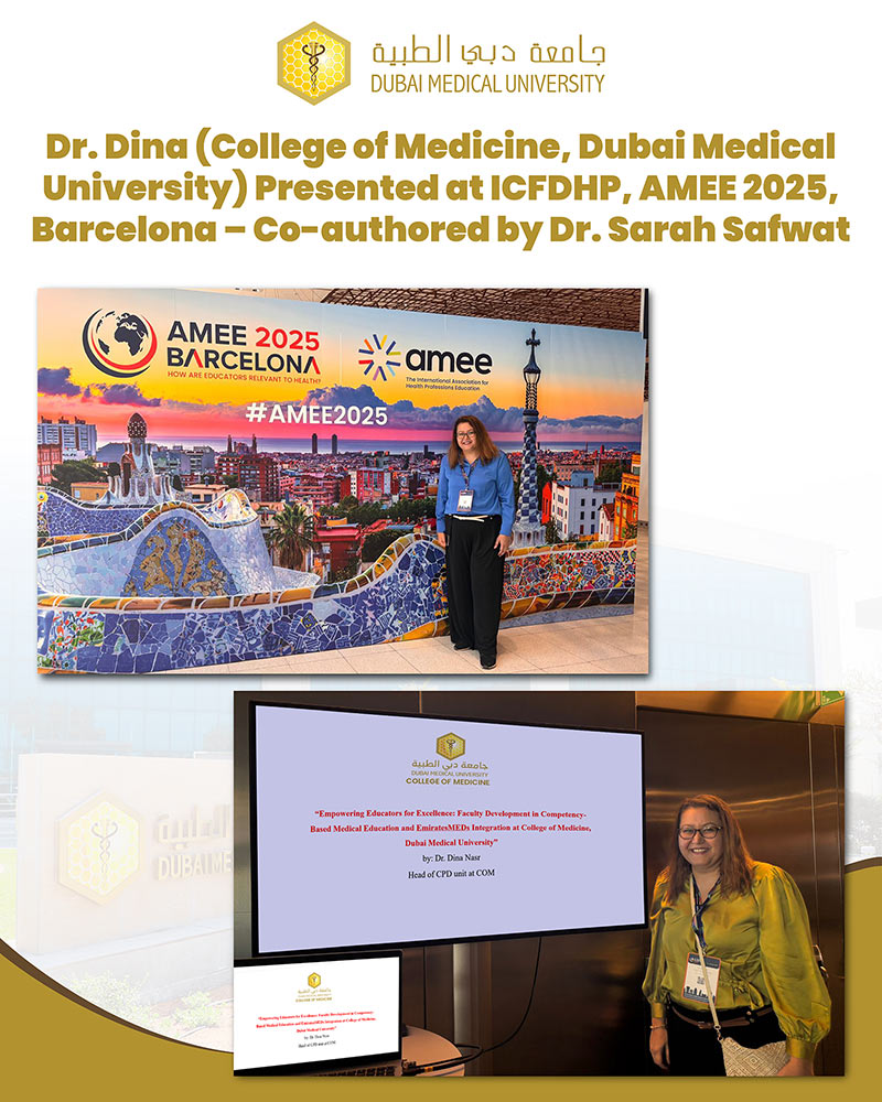We are proud to announce that Dr. Dina Mohamed Salah represented Dubai Medical University – College of Medicine at the 8th International Conference on Faculty Development in the Health Professions (ICFDHP), held as part of AMEE 2025 in Barcelona, Spain.