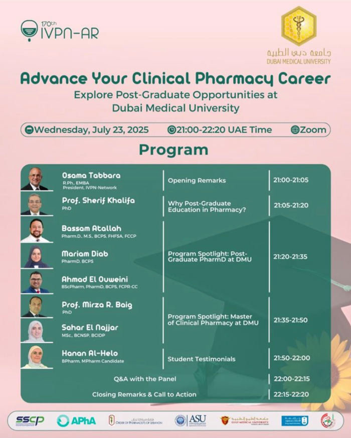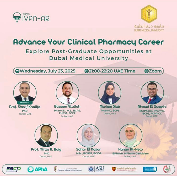 On July 23, 2025, Dubai Medical University College of Pharmacy co-organized and delivered a Global Webinar in Collaboration with IVPN-Network, titled “Advance Your Clinical Pharmacy Career – Explore Post-Graduate Opportunities at DMU” in collaboration with the College of Pharmacy at Dubai Medical University (DMU).