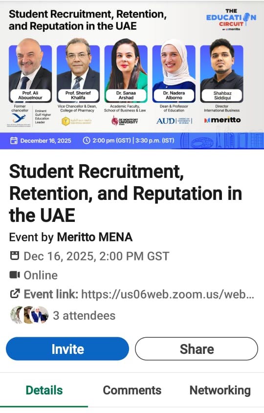 Hosted by Meritto MENA, the live session brings together prominent higher education leaders to explore how UAE institutions can better respond to rapidly evolving student expectations—particularly in how they communicate value, build a sense of belonging, and deliver meaningful learning experiences.